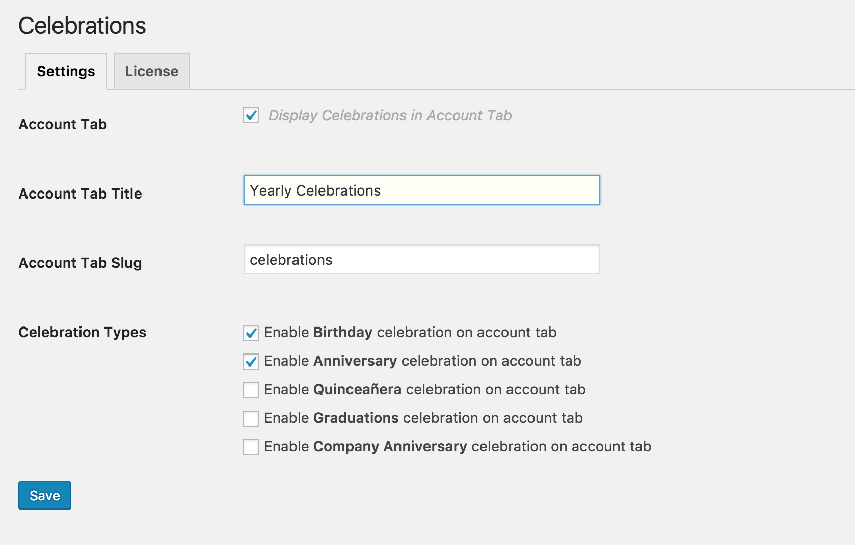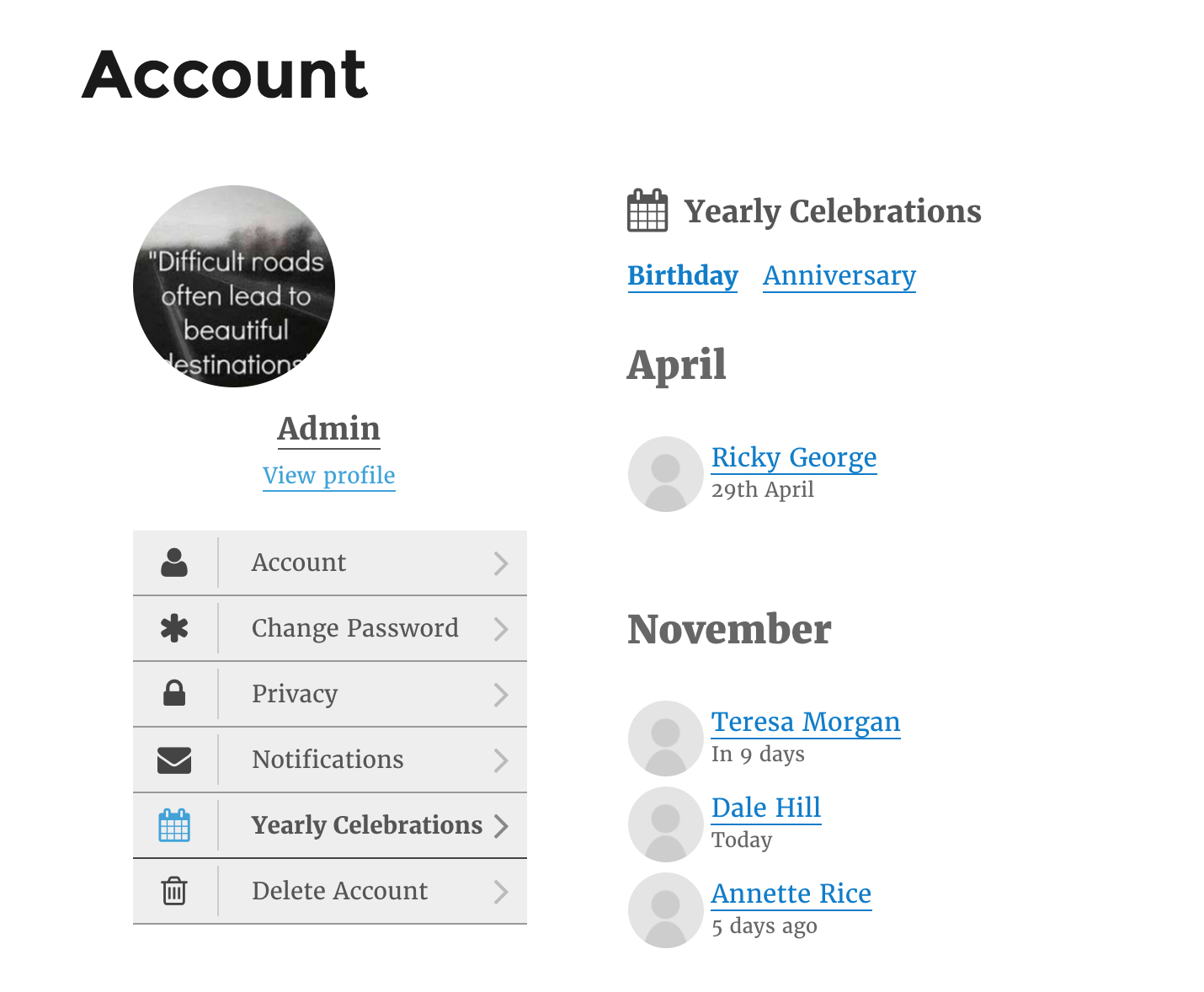 This extension for highlighting yearly celebrations such as Anniversaries and Birthdays. It can also be used to highlight special life events such as Quinceañeras, Work Anniversaries, Graduations, Sweet Sixteen and so much more.