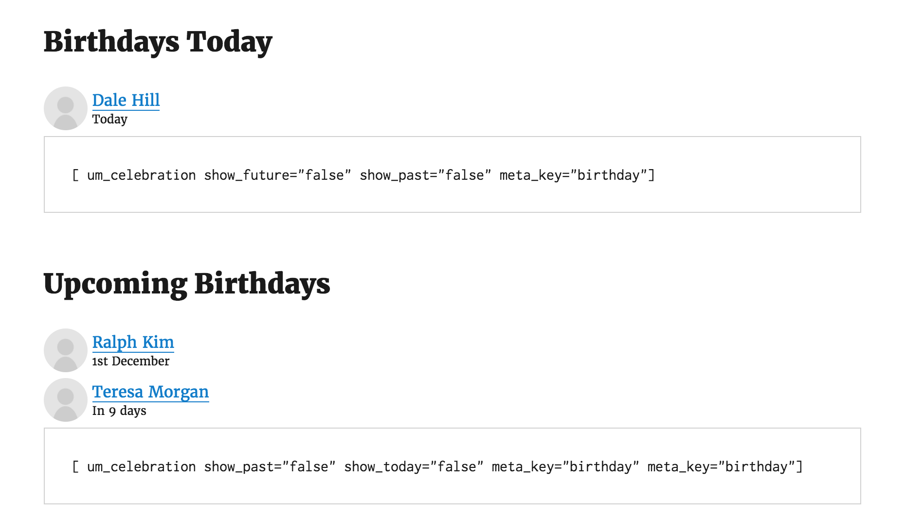 The Celebrations for Ultimate Member is an extension for your social network site. Easily take any date field and create a list of celebrations.